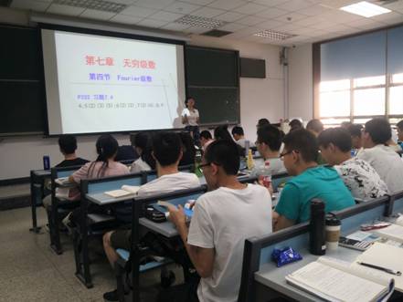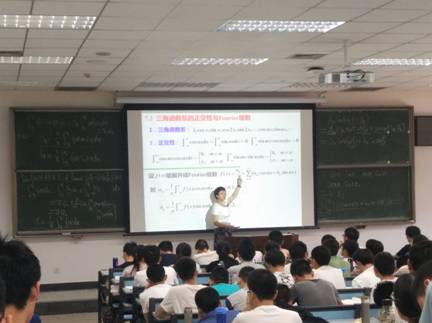 课堂上,赵小艳老师首先从函数展成幂级数时存在的局限性出发,引出三角级数的形式;然后通过对三角级数的详细推导,得到Euler-Fourier公式,从而导出Fourier级数的形式,最后根据导出的Fourier级数的形式来展示周期函数的Fourier展开的具体过程和结果。她从基础的问题开始讲解,一步步引导学生对问题进行深入思考,使学生不仅对Fourier级数得到的过程有了系统的了解,同时对Fourier级数展开的结果有了更加深入的认识。