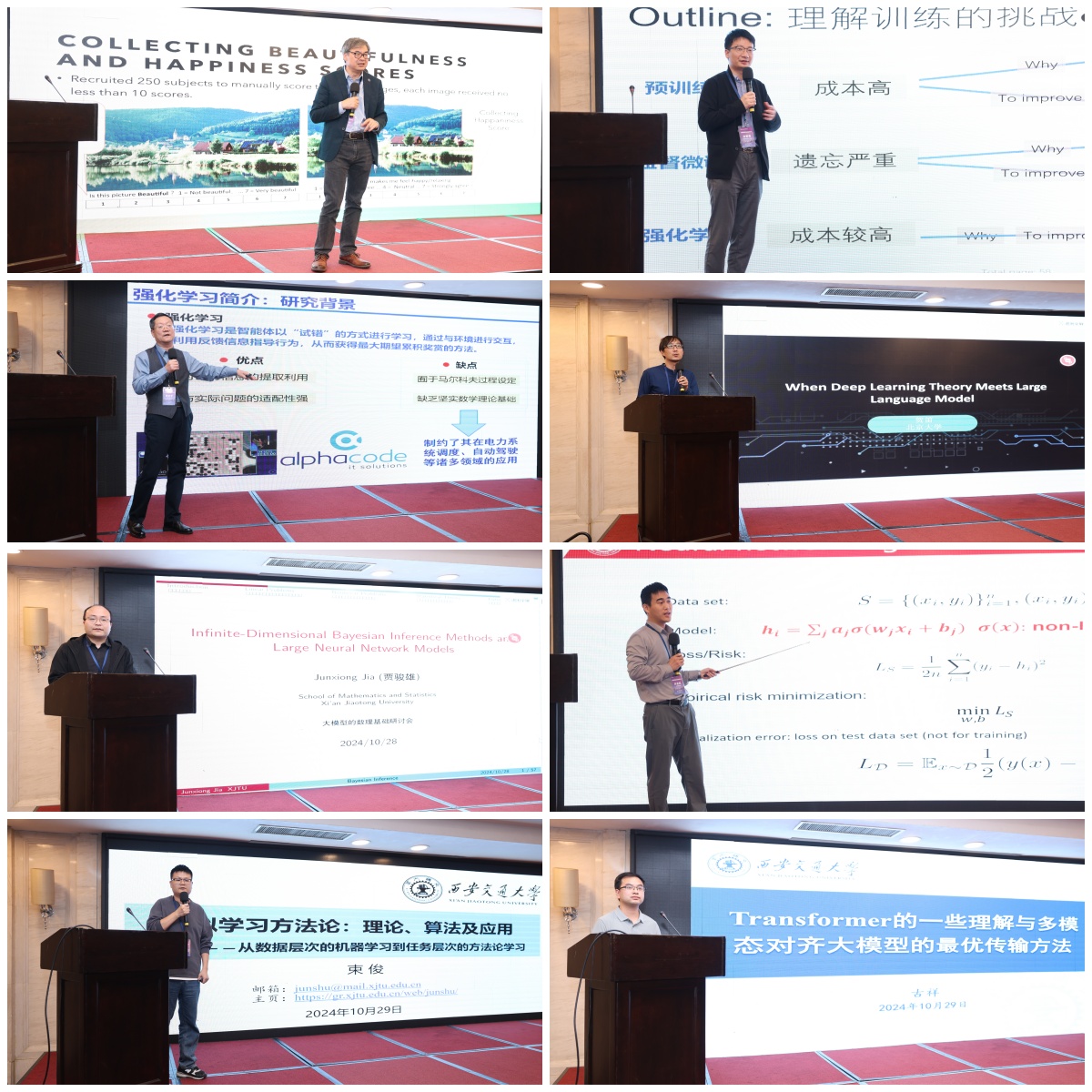 除了大会报告,研讨会还包括了九场特邀报告。香港中文大学(深圳)的孙若愚副教授讨论了大型语言模型训练算法的理解和提升,提出了一些新的优化方法。宁波诺丁汉大学的邱国平教授作了题为“Improving Mental Health and Well-being through Beautiful Imaging”的报告。北京大学的贺笛助理教授则围绕神经网络的表达能力,探讨了生成式语言模型的表达能力上限。上海交通大学的许志钦副教授,西安交通大学的陈志平教授、贾骏雄教授、束俊副教授和古祥助理教授也分别就现象驱动理解语言模型的推理与记忆、强化学习的模型与数学理论、无限维贝叶斯推断方法、模拟学习方法论以及Transformer的数学理解与多模态对齐大模型的最优传输方法等议题,同与会学者们进行了深入的探讨。